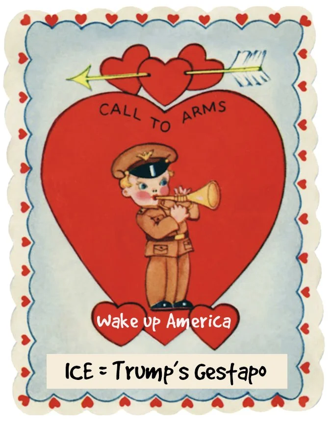 Our theme this month is “resistance valentines.” I have downloaded around 20 vintage valentine images and removed their original messages so that we can write our own specific messages of resistance. I will email these images to everyone who registers for the call. All you’ll need to bring to the call are print-outs of your favorite images that I’ve emailed you, scissors, and a couple of markers.